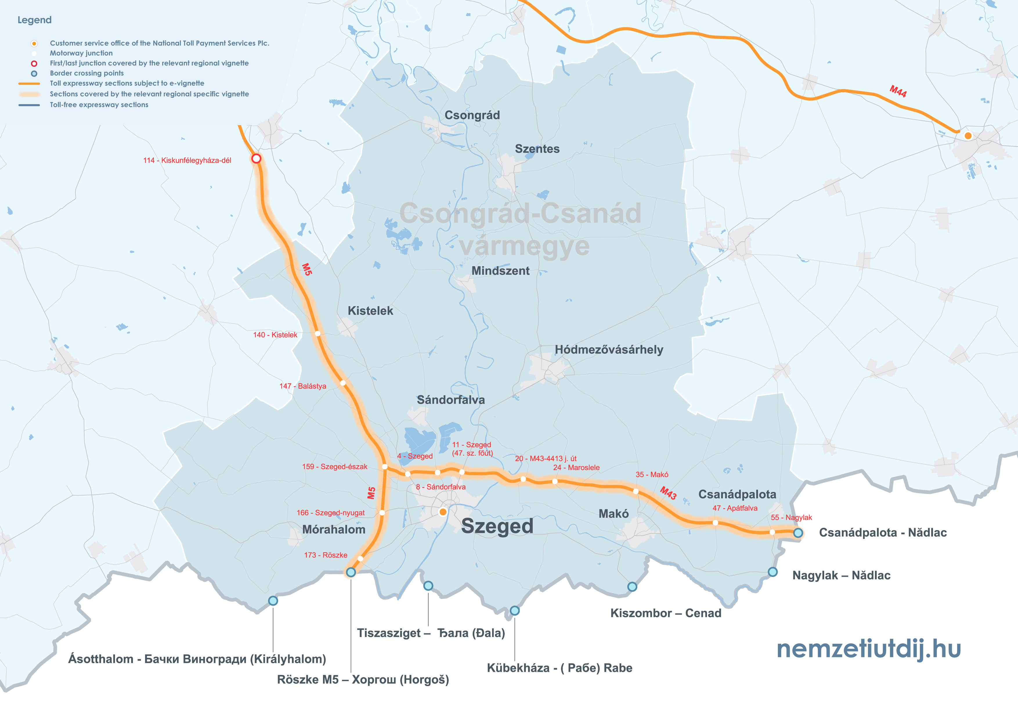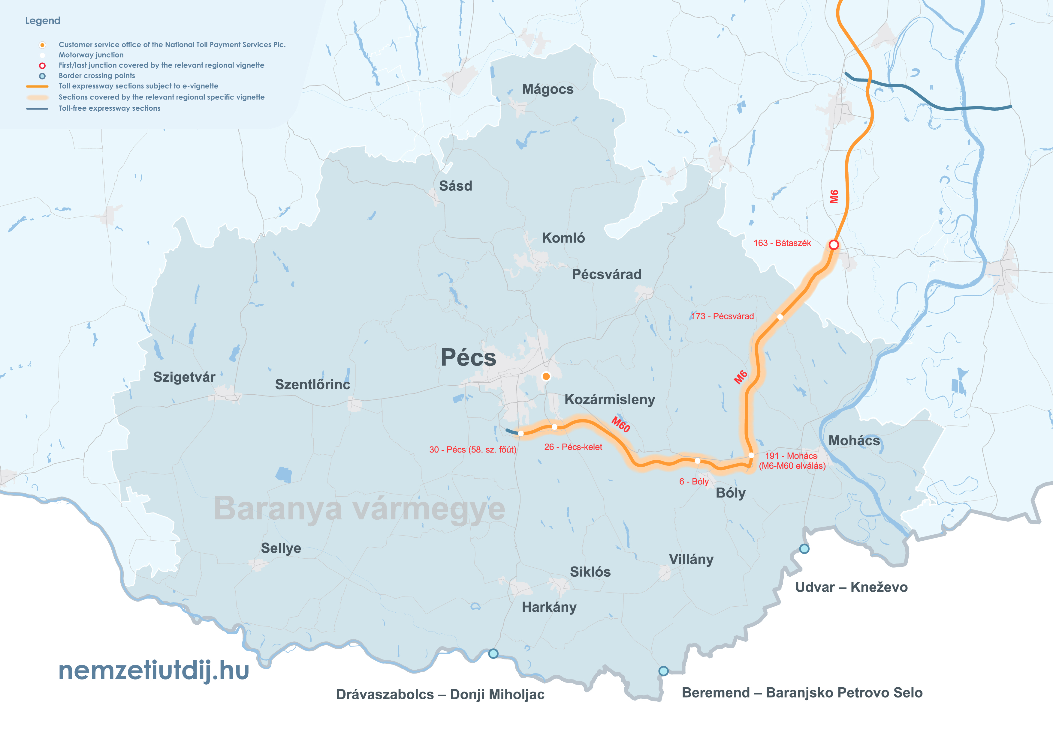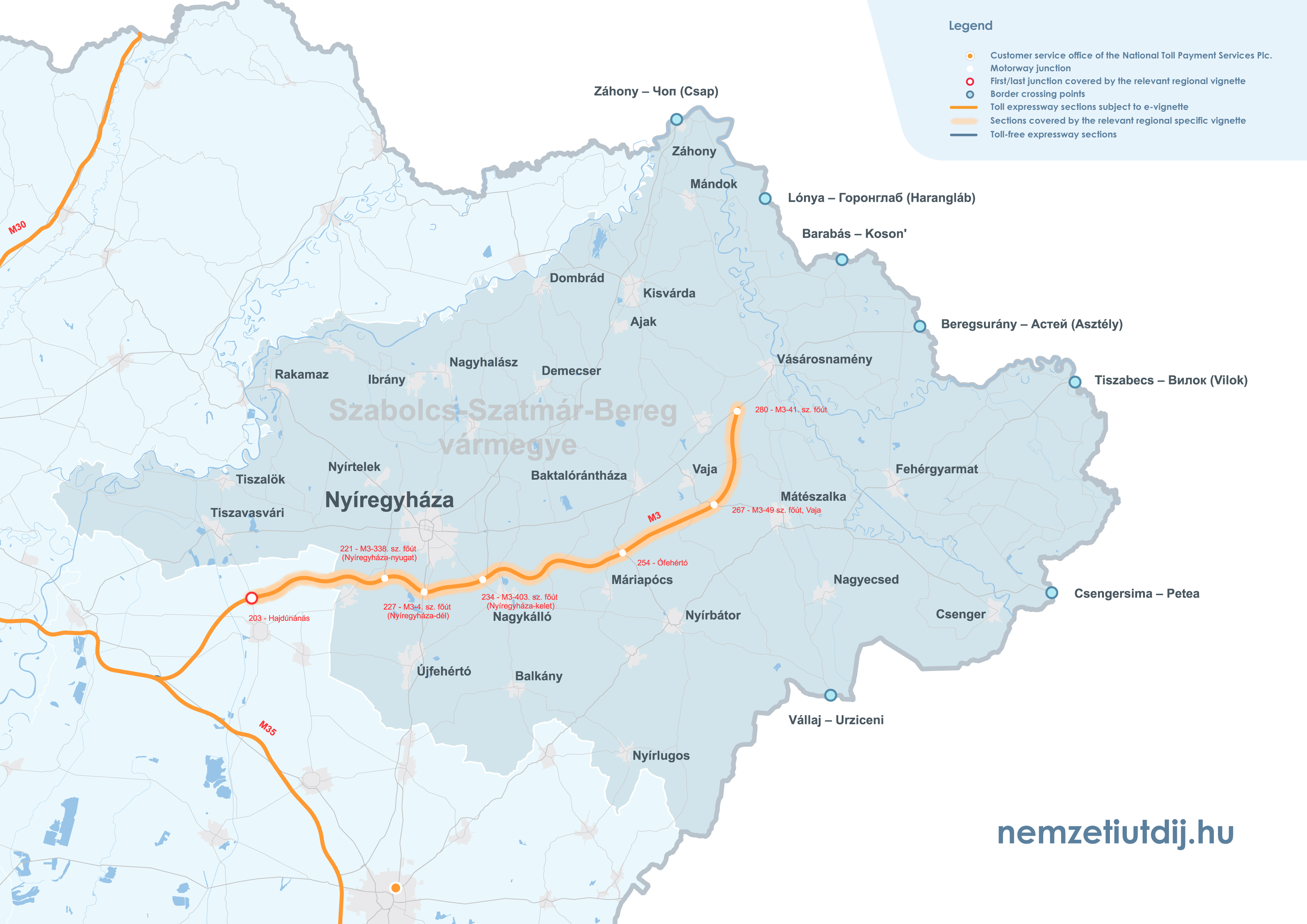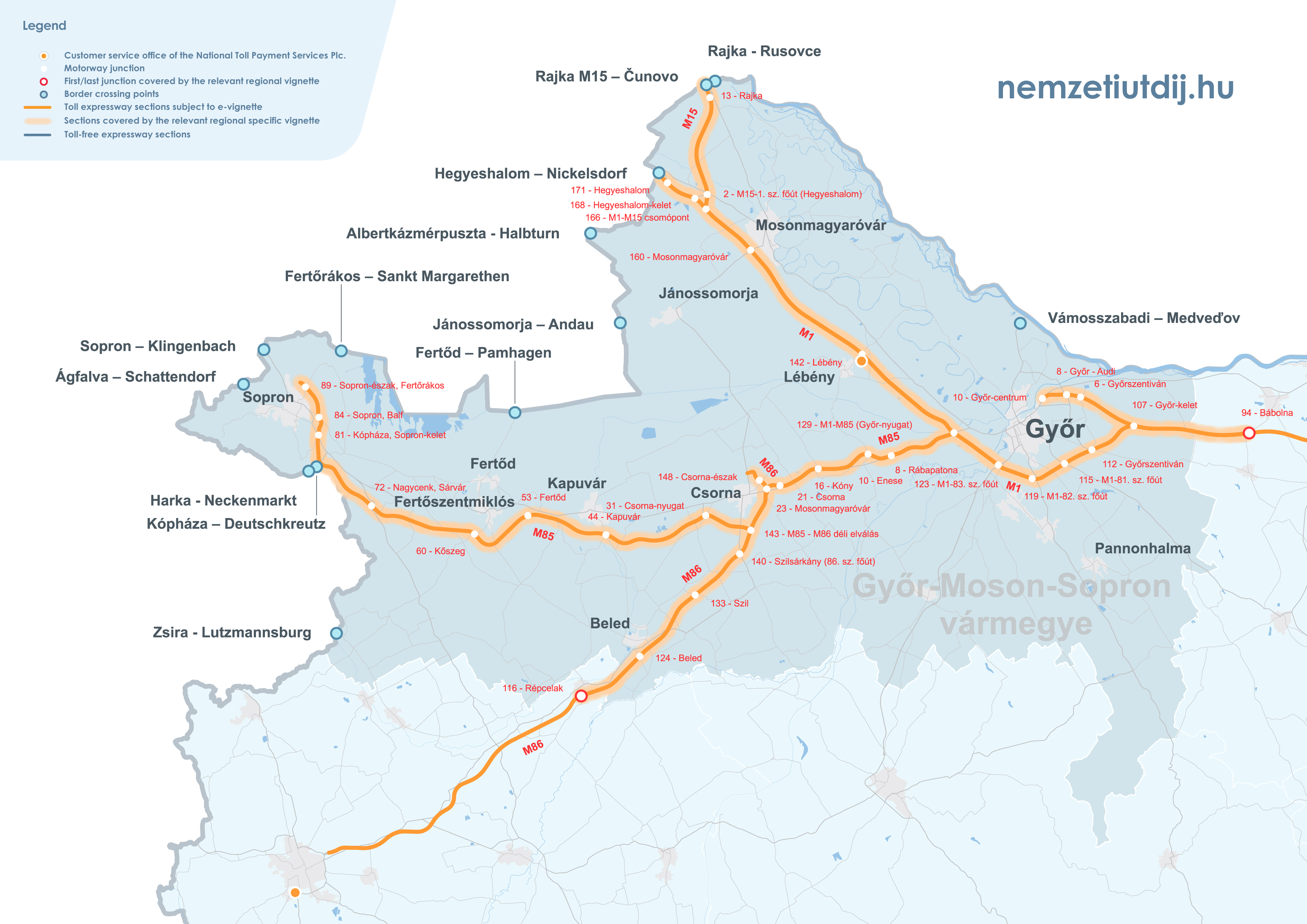 Rozsah platnosti regionálnych e-diaľničných známok sa rozširuje mimo administratívnych hraníc župy až po prvú križovatku za hranicou župy. Územná platnosť regionálnych známok podľa čísla križovatky a čísla úseku cesty je uvedená v prílohe 1 k vyhláške 45/2020 (XI. 28.) ITM ministra pre inovácie a technológie.