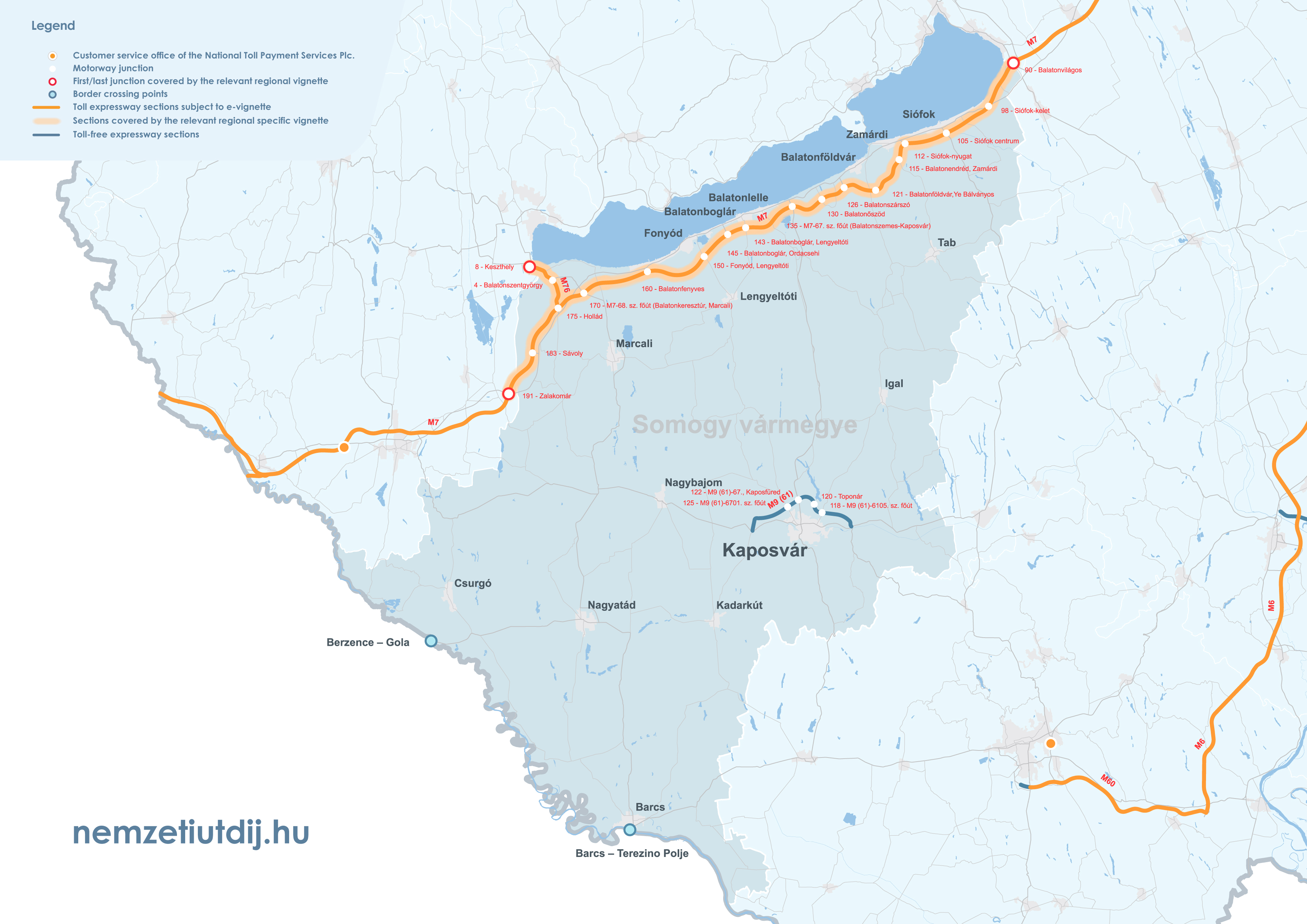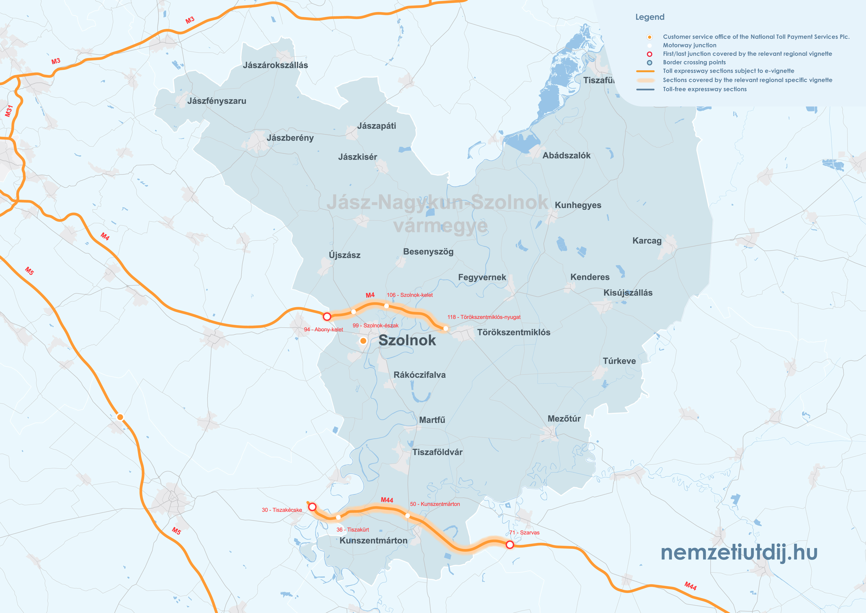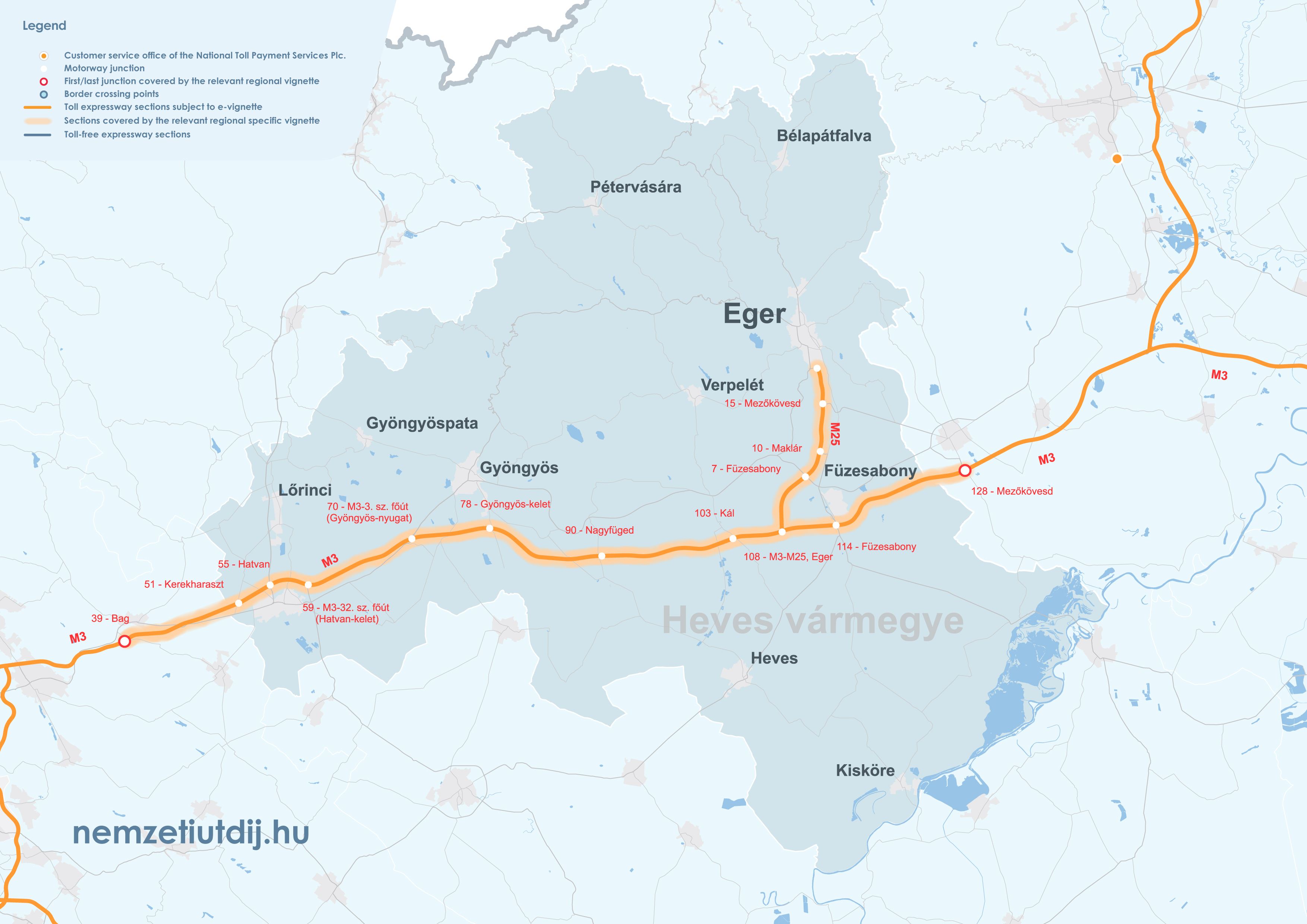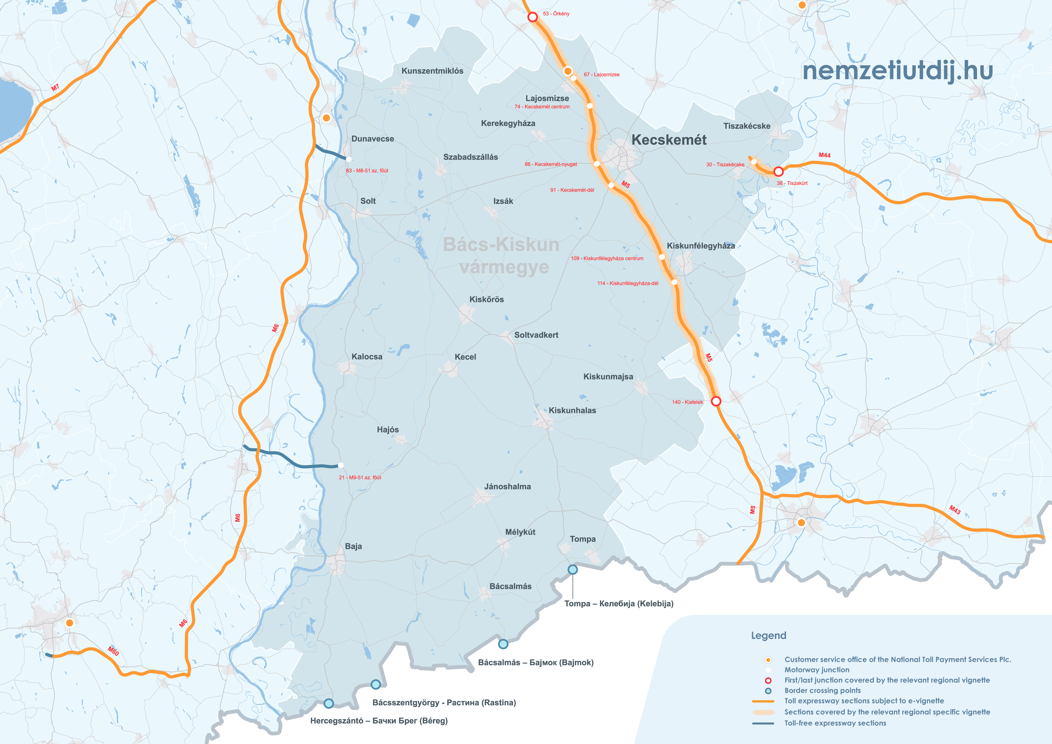 Rozsah platnosti regionálnych e-diaľničných známok sa rozširuje mimo administratívnych hraníc župy až po prvú križovatku za hranicou župy. Územná platnosť regionálnych známok podľa čísla križovatky a čísla úseku cesty je uvedená v prílohe 1 k vyhláške 45/2020 (XI. 28.) ITM ministra pre inovácie a technológie.